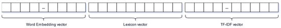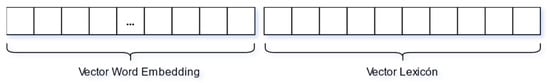 This approach represents the features vector as a concatenation of the output vectors of Word Embedding and Lexicon approaches. Figure 6 shows the process performed, doing this following its previously defined hyperparameters. Finally, these two vectors are concatenated, as shown in Figure 7, to apply Machine Learning algorithms. The vector size is 310, 300 boxes for the Word Embedding vector, and 10 for the Lexicon analysis vector.