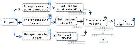 In a similar way as the previous approach, the features vector is presented with the concatenation of the Word Embedding and Lexicon vector, but the TF-IDF vector is also added. Figure 8 shows the process used for this approach. Unlike with the previous approach, now the corpus takes 3 paths to execute the 3 approaches with their preprocessing, following the previously defined hyperparameters. Finally, the 3 vectors are concatenated, as shown in Figure 9, to later apply the Machine Learning classifier. The vector size depends on the corpus and its words. This occurs on having the TF-IDF representation.