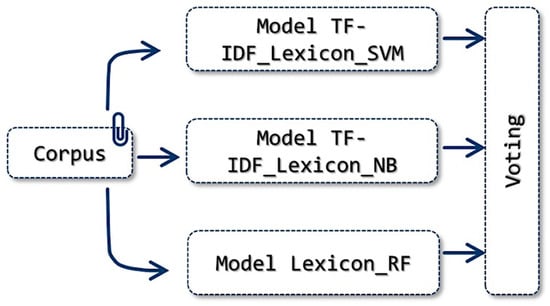 The first model created under this approach combines the three models implemented under the TF-IDF_Lexicon approach, as shown in Figure 10. Here, the corpus feeds 3 individually trained models, to then make a final prediction about the test corpus using the majority vote technique. This model is created under the hypothesis that the combination of the 3 models that use the TF-IDF_Lexicon approach will provide better results than each one of them separately, as they use different classifiers. The definitive values of the hyperparameters of each model, found previously using GridSearchCV on the different training datasets of the corpora, are used.