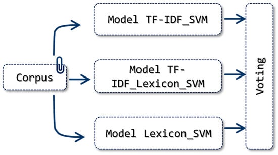This model combines those created with the Support Vector Machine classifier in the TF-IDF, Lexicon and TF-IDF_Lexicon approaches, as shown in Figure 11. Just as in the previous approach, the models are trained separately to then make a final prediction on the test corpus using the majority vote technique. This is implemented, as it is thought that by combining the different ways of obtaining the features vector, the result of the final classification can be improved. The Support Vector Machine classifier is used because it obtained the best performance in the preliminary tests. The different values of each model’s hyperparameters, found beforehand using GridSearchCV on the different training datasets of the corpora, are used.