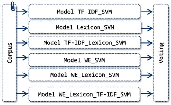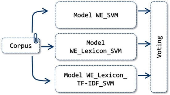 The third model created combines the models implemented with the Support Vector Machine classifier in the Word Embedding, WE_Lexicon and WE_Lexicon_TF-IDF approaches, as shown in Figure 12. The models are trained separately to then make a final prediction on the test corpus using the majority vote technique. This model, just as in the previous approach, is implemented under the hypothesis that combining the different ways of obtaining the feature vector can improve the final classification result. The hyperparameter values used in each model were found beforehand using GridSearchCV on the different training datasets of the corpora.