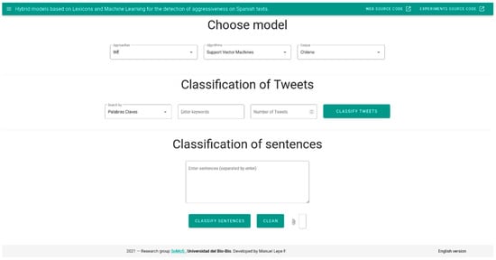 A web application (http://35.247.212.145/, accessed on 28 October 2021), which implements the models proposed for the classification of aggressiveness of the different corpora and other new ones written by a user was developed, to show the applicability of the models proposed, and to evaluate their performance through experiments. This application allows classifying comments, receiving feedback of the classification results, and building a base of labeled tweets for future research. The application also allows evaluating the performance of the model chosen with suitably structured test corpora. The performance results are provided using the F-measure metrics: Accuracy, Precision, and Recall. For back-end development, the FastAPI (https://fastapi.tiangolo.com/, accessed on 5 November 2021) framework was used, which allows building APIs using the Python programming language. The front-end was implemented using the Vue.js (https://vuejs.org/, accessed on 5 November 2021) JavaScript framework, along with the Vuetify (https://vuetifyjs.com, accessed on 5 November 2021) user interface library for Vue.js. Docker (https://docs.docker.com, accessed on 5 November 2021), while Docker-compose (https://docs.docker.com/compose, accessed on 5 November 2021) was used for the display. The web application code can be downloaded at https://gitlab.com/ManuelLepeF/lexicon_ml_agresividad_web, accessed on 28 October 2021. Figure 14 shows the user interface of the web application.