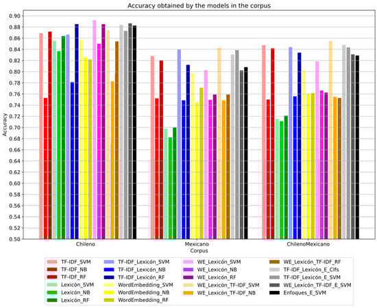 On the other hand, Figure 16 shows that the model with the best performance in the Accuracy metric for the Chilean corpus is WE_Lexicon_SVM, with 0.892. For the Mexican and Chilean-Mexican corpora, it is the WE_Lexicon_TF-IDF-SVM, model with 0.8431 and 0.8548, respectively.
