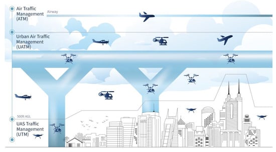 Unlike the operations of conventional aircraft, UAM vehicles are exposed to various obstacles during operations. In particular, since UAM vehicles fly very close to urban buildings, structures, and natural obstacles, it is necessary to apply precision navigation systems and communication systems in UAM vehicles to enable more precise flight operations than for conventional aircraft. The U.S. Federal Aviation Administration (FAA) is establishing the concept that low-altitude unmanned aerial vehicles (drones) controlled by UTM (UAS traffic management) systems will operate at or below 400 ft above ground level (AGL). Additionally, UAM vehicles will operate within a UAM corridor when cruising above 400 ft AGL. Conventional aircraft operate over the entire airspace [5]. Figure 2 shows the FAA concept UAM, UTM, and air traffic management (ATM).