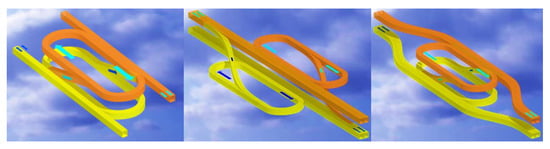 Through these considerations and assumptions, concepts of holding areas have been designed as shown in Figure 4. There are three conceptually designed holding areas, and they can be established differently depending on the regional characteristics. They are designed to be able to perform holding procedures at low altitudes, as well as to perform turning procedures in order to divert or fly over another flight route [6].