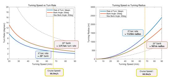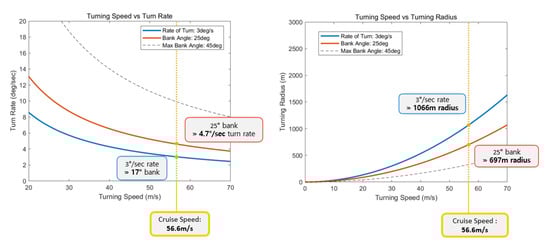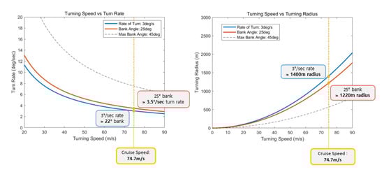 The result of the turning performance analysis of the Cessna 182T is shown in Figure 6. At a cruise speed of 74.7 m/s (about 269 km/h), the bank angle of 22° was calculated at a turn rate of 3°/s, and a turn rate of 3.5°/s was calculated at a bank angle of 25°. As a result of the turning radius calculation, the turning radius was derived as 1400 m when turning at a turn rate of 3°/s at cruise speed. When turning at a bank angle of 25°, the turning radius was calculated as 1220 m.