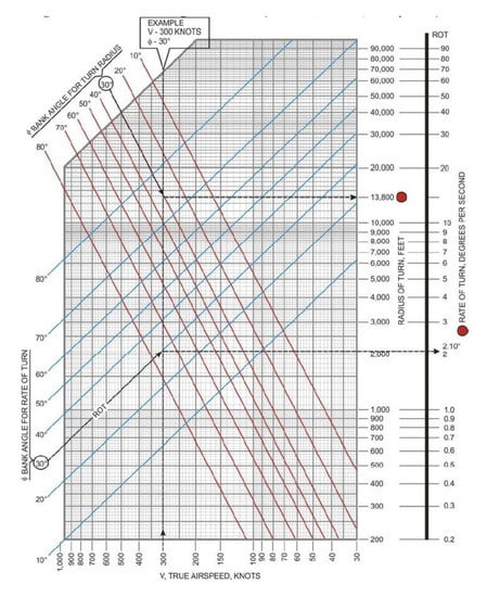 To verify the validity of the calculation result, it has been compared with the result using the aircraft’s general turning performance (GTP) chart. The GTP chart is a graph that confirms how much turning radius is obtained by comparing the bank angle, rate of turn, and speed when an aircraft turns [12]. According to the GTP chart, when the Cessna 182 turns at a bank angle of 25° and cruise speed of 74.7 m/s (about 145 knots), it can turn with a radius of about 1280 m. With a difference of about 60 m, the result of the calculation is relatively similar to the actual situation. Figure 7 shows the GTP chart of the aircraft.