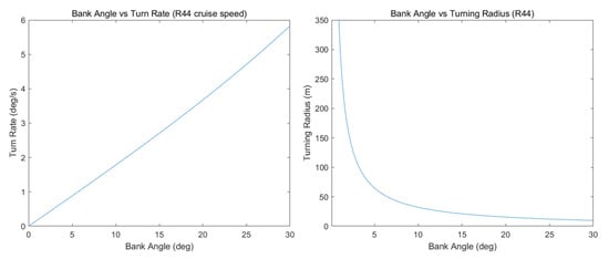 The result of the turning performance analysis of the Robinson R44 is shown in Figure 9. The cruise speed was not taken into account because rotorcraft can cruise at much lower airspeeds than fixed-wing aircraft. On the other hand, the bank angle can be applied as a more important factor when turning, because rotorcraft can turn in a narrow radius even with a small bank angle. Therefore, the Robinson R44 was able to turn within 400 m at any bank angle.
