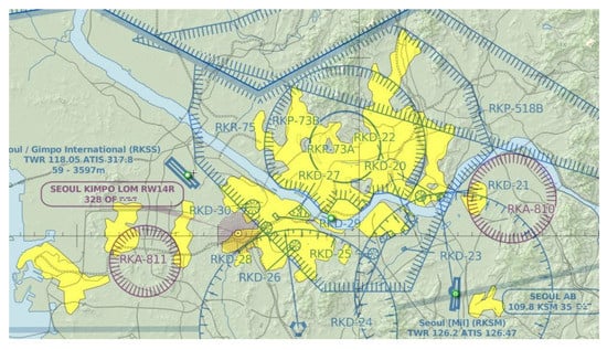The target area of this study is the Seoul and GyungIn area. These areas were selected for the case study because the airspace structures such as prohibited areas, restricted areas, and danger areas are complex and there are control zones of two hub airports (Incheon International Airport and Gimpo International Airport). In addition, as 50% of the total population of Korea lives in the Seoul and GyungIn area, the possibility of using the service is high [16]. On the other hand, it is an optimal area for research and analysis for UAM flight routes and holding areas because there are various ground obstacles and noise-sensitive areas.