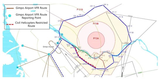 In Seoul and its suburbs, VFR (visual flight rules) routes have been established for visual flight operations by helicopters and general aviation aircraft such as Cessna 172S. These flight routes enable safe flight operations by avoiding ground obstacles and specific airspaces. Each flight route has visual reporting points, and pilots are required to report each time they pass these points as they fly along these routes. Major VFR routes include the P-73 VFR route that surrounds the edge of Seoul, and the Han River Corridor (Yongsan Corridor, Nodeulseom Corridor) established along the Han River. In addition, Gimpo Airport VFR routes for arrival and departure from the airport have been established on the outskirts of Seoul [1]. Figure 11 shows the VFR routes in the Seoul and GyungIn area.