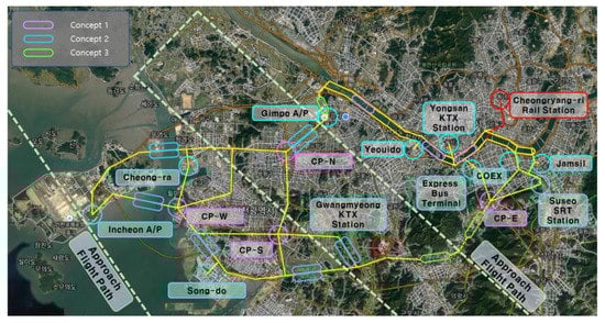 - Lee, Y.J.; Kwag, T.H.; Jeong, G.M.; Ahn, J.H.; Chung, B.C.; Lee, J.W. Flight routes establishment through the operational concept analysis of Urban Air Mobility system. J. Korean Soc. Aeronaut. Space Sci. 2020, 48, 1021–1031. [Google Scholar] [CrossRef]
