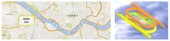 In this study, the multicopter-type UAM vehicle, which is relatively easy to turn even in a narrow radius, has not been considered, and the performance has been analyzed mainly for fixed-wing-type UAM vehicles with high speeds and low turn rates compared to multicopter-type UAM vehicles. Additionally, among the three holding area concepts, the concept 1 holding area that requires the narrowest radius was targeted, and the turning radius was assumed to be 400 m (800 m in diameter) to enable flight operations within the width of the Han River [6]. The concept of the width of the Han River and the holding area applied to the Han River is shown in Figure 14. It is assumed in the performance analysis that the UAM vehicles are turning at a constant speed in fixed-wing mode.