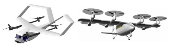 Wingless-type vehicles are classified as multicopter types. These vehicles do not have fixed wings and are equipped with multiple propulsion units (motors and propellers). Winged-type vehicles with fixed wings are classified as the lift‒thrust type and vectored thrust type. First, the lift‒thrust-type vehicle is one in which the propulsion part for vertical takeoff and landing and the propulsion part for cruise mode operate independently. Due to its simple mechanical structure, it is lighter and cheaper than a vectored thrust-type vehicle. However, due to the propeller used for vertical takeoff and landing, it receives more drag. The vectored thrust-type vehicle includes tilt-prop and tilt-wing-type vehicles. It has complicated mechanical structures, making it the heaviest and most expensive, but it has the best flight performance because it is the fastest and can cover the longest distances [4].