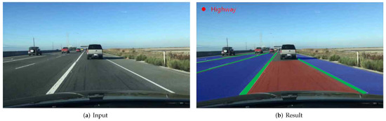 Starting with the AlexNet [15], most of the image classification tasks utilize deep learning. The residual network [16] allows the training of very deep networks without exploding or vanishing gradient problems through skip connection. In the sense of scene classification, deep neural networks that can effectively process an entire input image at a fast speed are widely used [17,18]. In this paper, we classify road types to share the global representation with drivable area estimation and lane line segmentation.