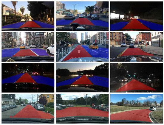 The results of the proposed drivable area estimation are depicted in Figure 4. The drivable areas for both ego-lane and alternative drivable lanes are sufficiently well segmented in a complex environment, for example, highway, city, night, curve, parking lot, single lane. The light reflection can causes errors where light is insufficient at night, but the drivable area is well preserved. The areas in the opposite lane are excluded from the drivable area, and it was successfully differentiated from the opposite driving lane even on a road with sparse lanes. Free space between the cars parked on the road was also well detected. Figure 5 shows the lane line segmentation result. In this experiment, following the ground truth of the BDD dataset, the crosswalk is considered as lane line. Some lane lines are occluded by other objects on the road. However, the result shows that multiple lanes lines are well estimated under various conditions even on a rainy day.
