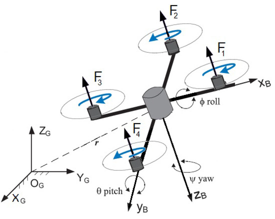 Considering a quadcopter (presented in Figure 1) as a vehicle with four independent drives and with an electric power system located at its center of gravity, it is important to define coordinate systems in order to determine the position. A model device has six degrees of freedom, where vertical movement in the global coordinate system and three Euler angles are controlled parameters. There is a need to assume a body fixed frame and a symmetrical structure of the model with the origin in the center of mass, where every drive is independently controlled and aerodynamic effects are negligible. The mathematical model is taken from [26].