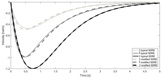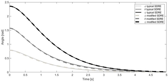 In every case of and matrices configuration after a short transition phase, all angles are stabilized at a required point (Figure 2, Figure 3 and Figure 4). The waveforms for both methods are convergent. Changing the value of and matrices affects only the speed of regulation. Small differences are due to numerical errors and pseudoinversion inaccuracy.