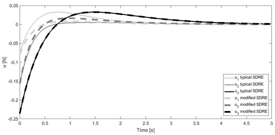 The state-dependent Riccati equation (SDRE) method has become more popular due to the possibility of designing more effective nonlinear controllers and providing flexibility through state-dependent weighting matrices, which is well presented in [1]. This method scheme originates from the LQR method [2,3] and is also similar to the MPC (or its nonlinear version, NMPC) [4,5,6]. The main differences between SDRE and those two methods are, for example, unlike the LQR method, the SDRE sets up its control laws at every time-step. The MPC method requires a convex optimization technique, while SDRE and LQR methods utilize optimal control laws for linear systems [7,8].