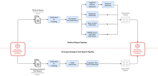 In this research, we aim to extract information from medical reports and neuropsychological tests. The following patient attributes are of interest: the date of visit, the AD-specific deficits (e.g., memory or language deficits) as well as their perceived onset, the corresponding diagnoses, the value of the MMSE score, and the cognitive test results. To extract these patients’ attributes from the hospital information system (HIS), we prepared two different pipelines. The first, the medical report pipeline, extracts all patient attributes besides the cognitive test results. The second, the neuropsychological test (NPT) report pipeline, extracts the cognitive test results of the CERAD test battery, which is stored in a semi-structured format. All extracted attributes are mapped to the variables of the DESCRIBE cohort study in order to enable semantic integration [5]. The variables of the DESCRIBE cohort study are also mapped to Unified Medical Language System (UMLS) concepts (see Medical Data Models Portal [21]; https://medical-data-models.org/details/13956, accessed on 25 September 2021). An overview of the developed pipelines is shown in Table 2.