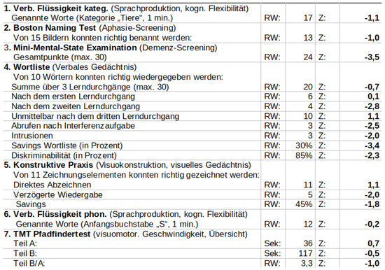 The CERAD table consists of seven different categories. The amount of tests belonging to each category strongly varies. Whereas there is only one test for the verbal fluency, the category verbal memory consists of eight sub-tests. In total, the test battery comprises 18 tests. The scores of the CERAD test battery can be given in different units in NPT reports. The medical experts provide raw values for the specific evaluation metric, such as the absolute amount of words mentioned by the patient. Moreover, these raw values can be transformed into relative values, such as Z-value, which are standardized toward their associated feature, for example, age and gender. As not all reports are complete—some reports only contain raw values, whereas others contain only transformed values—we developed rules for the extraction of all different kinds of values. In Figure 2, an example of a complete CERAD test battery result table of a single patient can be seen that has two columns for both raw (in German abbreviated as RW) and Z-values. Example rules can be seen in Table A7.