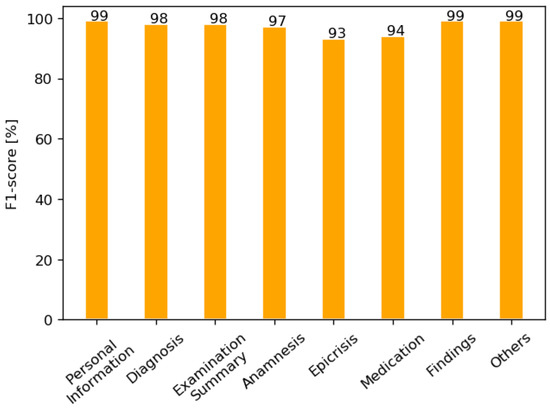 In the following, detailed results from our evaluations are shown for all pipelines and all classes. In Table A1, precision, recall and F1-score are shown for the extracted sections of interest. Out of these sections, we currently further process four sections, namely Personal Information, Anamnesis, Diagnosis and Examination Summary. We reach F1-scores above or equal to 97% for these sections.