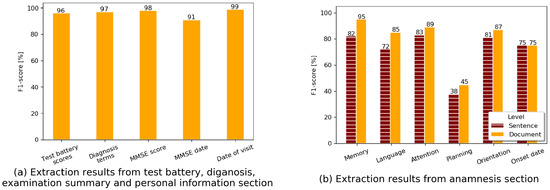Summary of information extraction results. (a) Results of extraction test battery scores, diagnosis terms and date of visit. (b) Results of extraction of AD-specific cognitive deficits from anamnesis pipeline. The detailed results containing precision and recall can be found in Appendix A in Table A2 and Table A3.