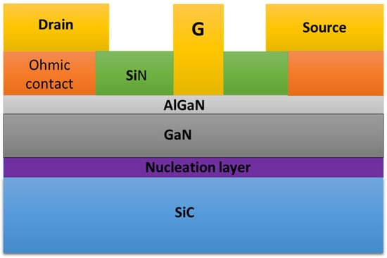 The high electron mobility transistor (HEMT), based on aluminum gallium nitride/gallium nitride (AlGaN/GaN), is an important electronic component thanks to its structure and materials. Gallium nitride GaN is characterized by high mobility, very high electrical breakdown field and high thermal conductivity [5,6]. Thanks to these characteristics, these components have been used in different high-temperature and high-frequency applications [7,8], such as airborne systems, telecommunication and electronic warfare [9,10]. HEMT has also been used in several systems such as high-power amplifiers, satellites and radars [11].