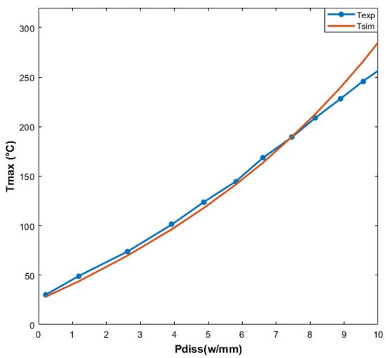 To study the evolution of the operating temperature as a function of the dissipated power, we performed several numerical simulations. The obtained results are presented in Figure 3 with the experimental results that were obtained by the optical Raman-Micro-Spectrometry method. According to the figure, we notice that the HEMT temperature increases according to the dissipated power by a non-linear variation; it reaches rather important values at a very high dissipated power. The curve of the results of simulations and experiments are in good correlation. The small deviation between the curves, and especially in the case of high power, is due to the fact that we neglected the other modes of heat transfer, as we have previously mentioned. We will consider that this criterion is sufficient to validate the finite element model developed.