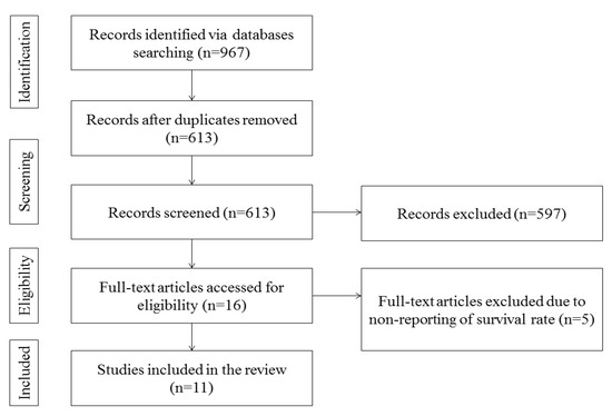 A total of 967 titles were obtained as a result of the search from all electronic databases, out of which only 57 abstracts were suitable for this review. Overall, 16 studies were further considered for full-text review based on the applicability of the exclusion criteria. Further scrutiny led to exclusion of 5 full-text studies, which resulted in an overall 11 articles from which quantitative and qualitative data were gathered for final analysis. The study identification flowchart as per PRISMA is depicted in Figure 1.