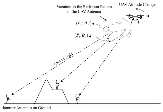 Figure 1 shows a UAV jammed by a ground jammer in the line of sight. The radiation pattern of the UAV antenna is shown to change according to the attitude change. When the jamming power is applied to the jammer, the jamming power received by the UAV receiver can be expressed by the following equation: