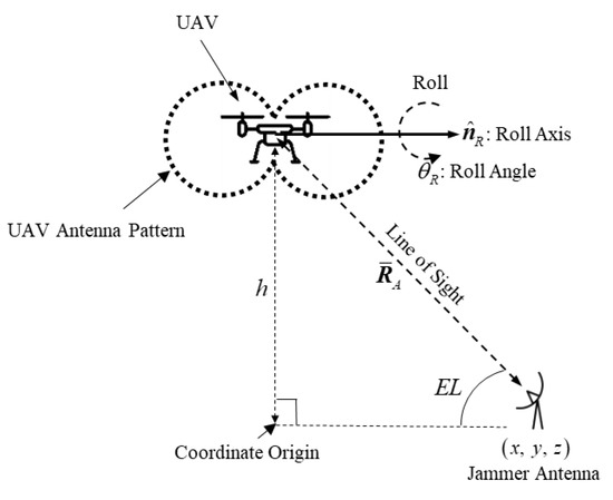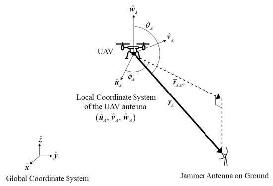 Figure 3 shows the configuration of a small hovering UAV jammed by a jammer on the ground. The positions of the UAV and jammers are defined in the global coordinate system. The UAV is at height from the origin of the global coordinate system and the jammer is at on the ground. In Figure 3, is the vector from the UAV position to the jammer position and is the elevation angle, which is the included angle between the vector and the horizontal plane at the jammer position.