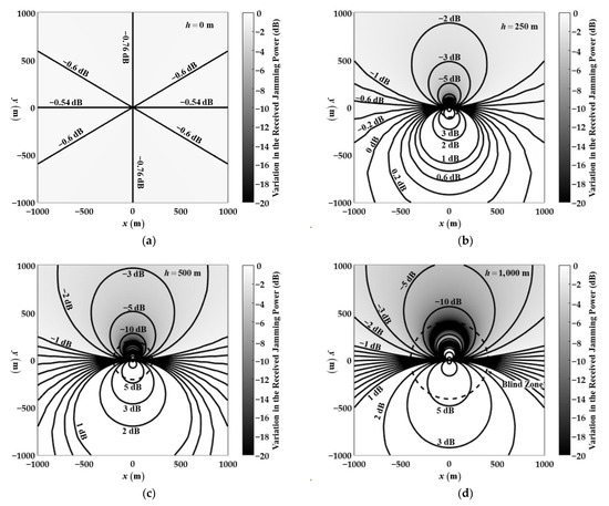 Figure 4b–d shows the cases when the height of the UAV and the jammer are different. As in Figure 4a, the power variations in are due only to gain variation. In other locations, the power variations are contributed both from the gain and PLF variations. The variation is overall increased as the height difference increases because the jammer location is closer to the null direction of the omnidirectional antenna, where the gain and polarization variation is large.