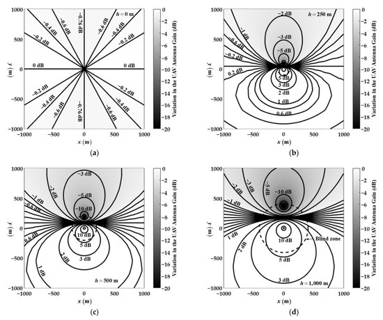 Figure 4a shows the case when the height of the UAV and the jammer are the same. The line with is perpendicular to the axis of rotation. Thus, there is no PLF variation. On the other hand, on the line with , there is no gain variation. Thus, the power variation shown in −0.76 dB and −0.54 dB in and are due only to gain and PLF variations, respectively. In other locations, the power variations are contributed both from the gain and PLF variations.