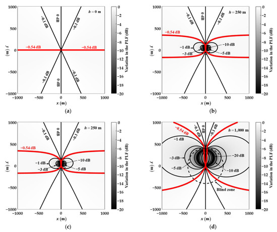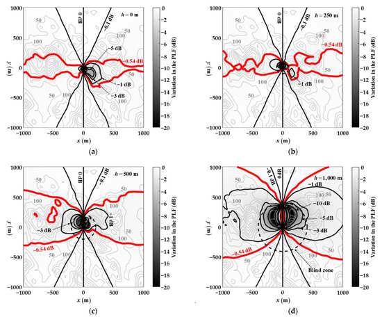 In order to show the contributions of the gain and PLF variations separately, they are separately shown in Figure 5 and Figure 6. It can be seen that Figure 4 and Figure 5 are almost the same because the gain variation is dominant in most locations. However, near the rotation axis, the two sets of figures are notably different because of the contributions from the PLF variation. The contribution from the PLF variation is shown in Figure 6. As shown in Figure 6a, when the height of the UAV and the jammer are the same, the maximum variation in the PLF of −0.54 dB occurs in , which is the axis of rotation. As shown in Figure 6b–d, the larger the height difference between the two antennas, the greater the variation in the PLF, because the jammer location is closer to the null direction of the omnidirectional antenna.