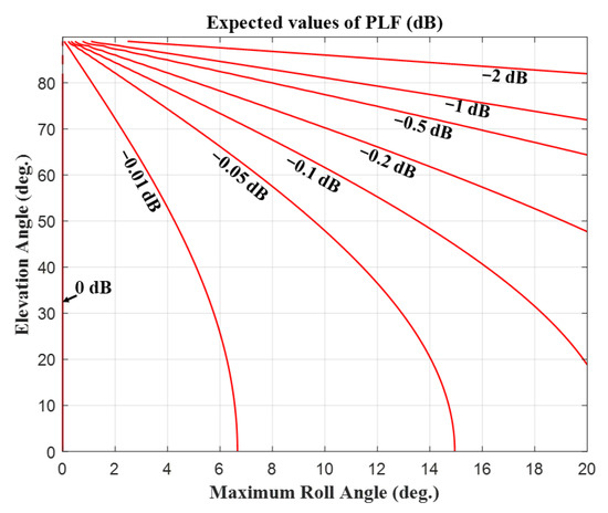 where is the height difference between the jammer and the UAV, and is the distance between the jammer and the UAV. The expected values of PLF according to and are shown in Figure 8. The larger the maximum roll angle and the larger the elevation angle , the greater the expected polarization loss .