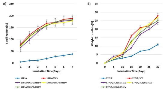 3.5. Swelling Behaviors and Weight Loss Properties of Scaffolds