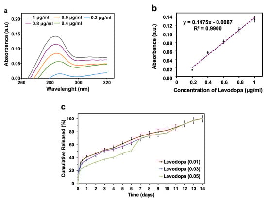 | Prepared Solutions at Various Concentration | PLA Content (wt.%) | CS Content (wt.%) | Levodopa Content (mg/mL) |