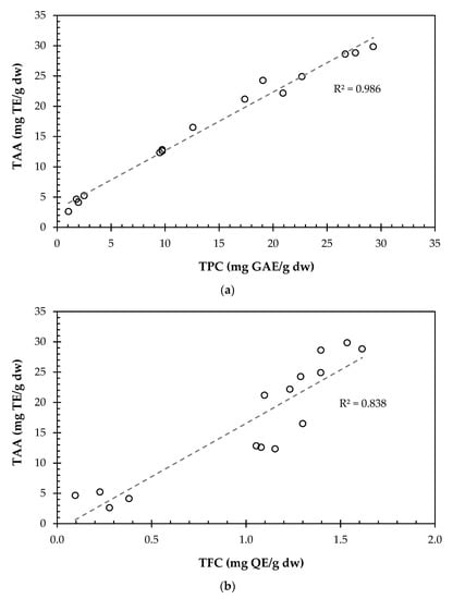 Correlation of TPC (a) and TFC (b) values with the TAA for the conventional extraction.
