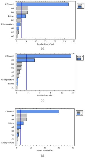 Pareto charts for TPC (a), TFC (b), and TAA (c) for the conventional extraction experiments.