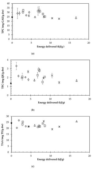 In order to analyze the ultrasound effect on the internal mass transfer, the TPC, TFC and TAA values were plotted versus the specific energy consumption (Figure 3). It can be observed that the use of ultrasound does not increase the highest TPC (Figure 3a) value obtained by conventional extraction (C8, Table 1), which indicates that there is no internal resistance to the mass transfer when using the cornelian cherry to recover bioactive compounds. The same conclusion could be formulated in the case of the TAA (Figure 3c) and the TFC (Figure 3b).
