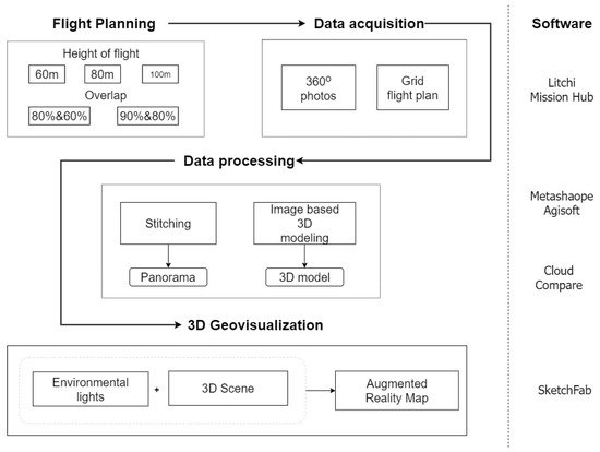 Methodology flow chart: flight planning, data acquisition, data processing, 3D geovisualization and the software that was used.