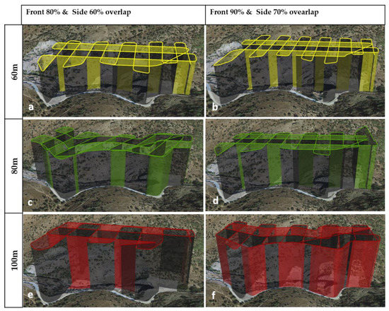 For each of the above scenarios, a different flight plan was designed using the Litchi Mission Hub flight planner [67] that met all the parameters (flight altitude and overlap) that emerged from the investigation into the scale issues. Initially, two flight planning parameters were investigated: the flight altitude and the overlap of the images. Overall, six flight plans were created at three different flight altitudes of 60 m, 80 m, and 100 m, and in two different overlaps, 80% front overlap with 60% side overlap and 90% front overlap with 70% side overlap (Figure 4), for the 3D mapping of the gorge. The design pattern of all flights was in grid form and the aircraft’s orientation was to the next waypoint. The aircraft camera was vertical to the ground (nadir), and the flights maintained a constant altitude above the ground. The front overlap of the images was adjusted by the aircraft’s speed with the assumption that the UAS would capture images every 2 sec. The characteristics of the flights performed for data collection are described in Table 2. More specifically, both Flight 1 and 2 were realized at 60m height with different front and lateral overlaps; thus, 282 and 462 images were collected, respectively. Both Flight 3 and 4 were executed at 80 m having overlap values of 80% and 60% and 90% and 70%, respectively. The number of images collected from these flights were 307 and 391, respectively. As for the flights realized at 100 m altitude, 201 and 275 images were acquired having the same overlap values as at lower altitude.