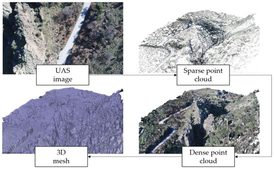 Quality control of the images was first executed on a visual level using the image quality index (IQI). Images that were shaken or blurred were excluded from the image-based 3D modeling process. The selected images were then aligned using the structure-from-motion algorithm, creating a sparse point cloud. Then the dense point cloud was created by applying the multi-view stereo algorithm. The triangulation irregular network (TIN) method was then applied to the dense point cloud through which the points were joined together to create a 3D digital object in the mesh form (Figure 5). Then, the pixels of the high-resolution images collected by the UAS to generate the orthomosaic were orthorectified. The processing of data were the same in all data sets, and the same settings were used.