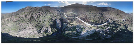 Then, for the geovisualization of the geosite, the textured 3D model of the gorge and the panorama image were used. The 3D model was uploaded in the Sketchfab software [70] and acquired texture from the jpg file created from the high-resolution images collected with the UAS. One of the special features of the geosites’ 3D models was that they represented outdoor areas. Therefore, the area of interest, when located in the outdoor space, was illuminated using as light sources (i) the sun, (ii) the sky, and (iii) the environmental lights [71]. The variety in landscape and the material reflectance created heterogeneous light sources that contributed to the light’s total intensity that reflected and lightened the mapping area in the 3D space.