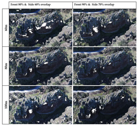 3D dense point cloud: (a) from the flight of 60 m with 80% front overlap and 60% side overlap, (b) from the flight of 60 m with 90% and 70% overlap, (c) from the flight of 80 m with a 80% and 60% overlap, (d) from the 80 m flight with 90% and 70% overlap, (e) from the 100 m flight with 80% and 60% overlap, and (f) from the 100 m flight with 90% and 70% overlap.