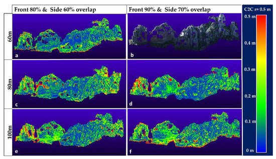 The visual observation made through the quality control mentioned above was confirmed by quantitative means of the cloud-to-cloud (C2C) distance algorithm of cloud comparison [69]. Initially, all (six) 3D point clouds were introduced into the Cloud Compare software (CloudCompare 2.11, 2020) and were segmented to the same extent. The point clouds were then registered on a reference cloud. The point cloud with the highest density was selected as the reference cloud and used to register all the other clouds. Then the C2C distance algorithm was applied, defining the cloud with the largest number of points as a basis for comparison and a fixed distance at which the two clouds’ points were calculated. As a reference cloud, the 3D point cloud created from the images collected at 60 m flight height with 90% and 70% overlap and side overlap was selected (scenario 2), and a radius of r = 0.5 m was applied (Figure 10b). Figure 10 illustrates the results of the C2C comparison.