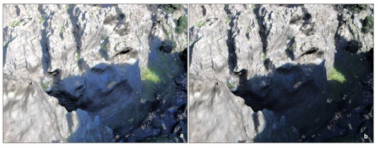 For this reason, the panorama of the area was chosen to act as environmental lights and was converted to a high dynamic range image (HDRI). A sphere produced from the panorama had its center of gravity in the 3D model of the geosite. The HDRI takes the pixel’s values and uses them as a light-emitting source, partially simulating a surrounding environment. Thus, the geosite 3D model was illuminated in the same way as it was illuminated at the time of the UAS data acquisition. Figure 11a shows a part of the 3D model that has been automatically visualized, where the shadows captured in the images were maintained in its texture. After using environmental lights in Figure 11b at the same part of the geosite’s 3D model, the respective shadows appeared smoother and softer.