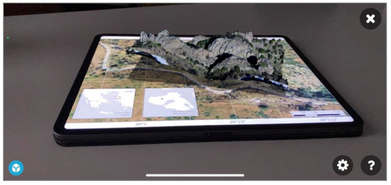 For the geosite’s visualization in a virtual environment, and for creating the augmented map, the Sketchfab software [70] was used. The scene created in the virtual space consisted of the following: (i) 3D model, (ii) texture, (iii) lights, and (iv) primary camera (https://skfb.ly/oqGYY accessed on 7 January 2021). The main camera defined the observer’s position and the field of view from that exact position. We used the method of third-person viewer for the observer to illustrate the gorge’s 3D model in the correct cartographic scale (1:400) on the augmented space. The observer–model distance was set to 80 m to achieve the best visualization of the geosite without unnecessary detail. Finally, an orthophoto map was used as a level on which to project the geosite’s augmented 3D model (Figure 12). The AR gorge geovisualization presented in Figure 12 is accessible from any mobile phone as long as the SketchFab application and the 2D map of the study area are installed. The 3D model of the geosite is available to the public in the SketchFab repository and can be selected. Using the mobile phone’s camera to point at the projection level (2D map) enhances the 3D model.