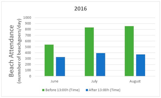 Our results regarding the daily temporal distribution of beachgoers are consistent with other beaches along the Mediterranean Sea [18,19,20].