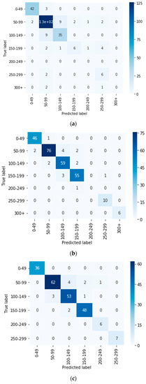 In order to check the robustness of the results, the model was revaluated for the time periods 2018–2020 and 2019–2021. Table 8 and Table 9 present the evaluation of the DNN in every category using the precision, recall, and F1-scores for the selected time periods and 10 independent runs. The DNN performs well in the classification task for all categories. In the time period 2018–2020, the best per-class F1-scores are obtained for different types of categories: a reduced number of beach visitors (50–99) and a high/very high number (250–299)/(300+). The category 100–149 shows the worst results for the F1-score due to the increase of false negatives (recall). The category 200–249 has an F1-score of 90% due to the increase of the false positives (precision). In the time period 2019–2021, the best per-class F1-scores are obtained for categories with a high/very high number of beach visitors (200–249; 250–299)/(300+). The categories 100–149 and 150–199 show the worst results for the F1-score due to the increase of false negatives (recall). We observe that for both time periods, the precision rate, recall, and F1-score are relatively stable for all categories. Therefore, we can conclude that the robustness of the model is not affected by the time periods chosen.
